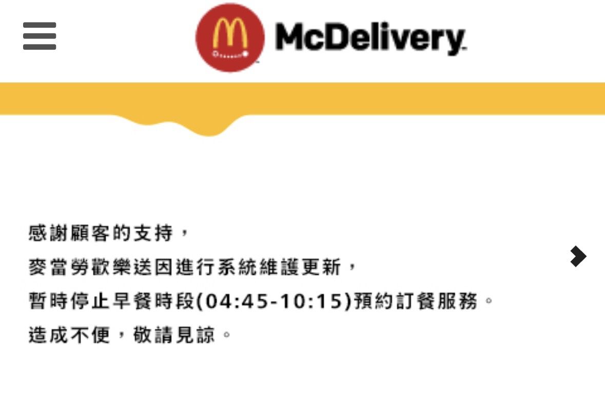 針對歡樂送預約訂餐服務關閉一事,麥當勞僅表示:「麥當勞歡樂送系統目前進行維護更新,暫時停止早餐時段(04:45-10:15)預約訂餐服務;其他時間顧客仍可使用歡樂送訂餐,感謝顧客的配合與支持。」《ETtoday新聞雲》查看APP發現,預約訂餐可預訂7天內餐點,不過目前一連7天的早餐時段皆無法預約訂餐,恐怕是憂門市無法負荷大量訂單。