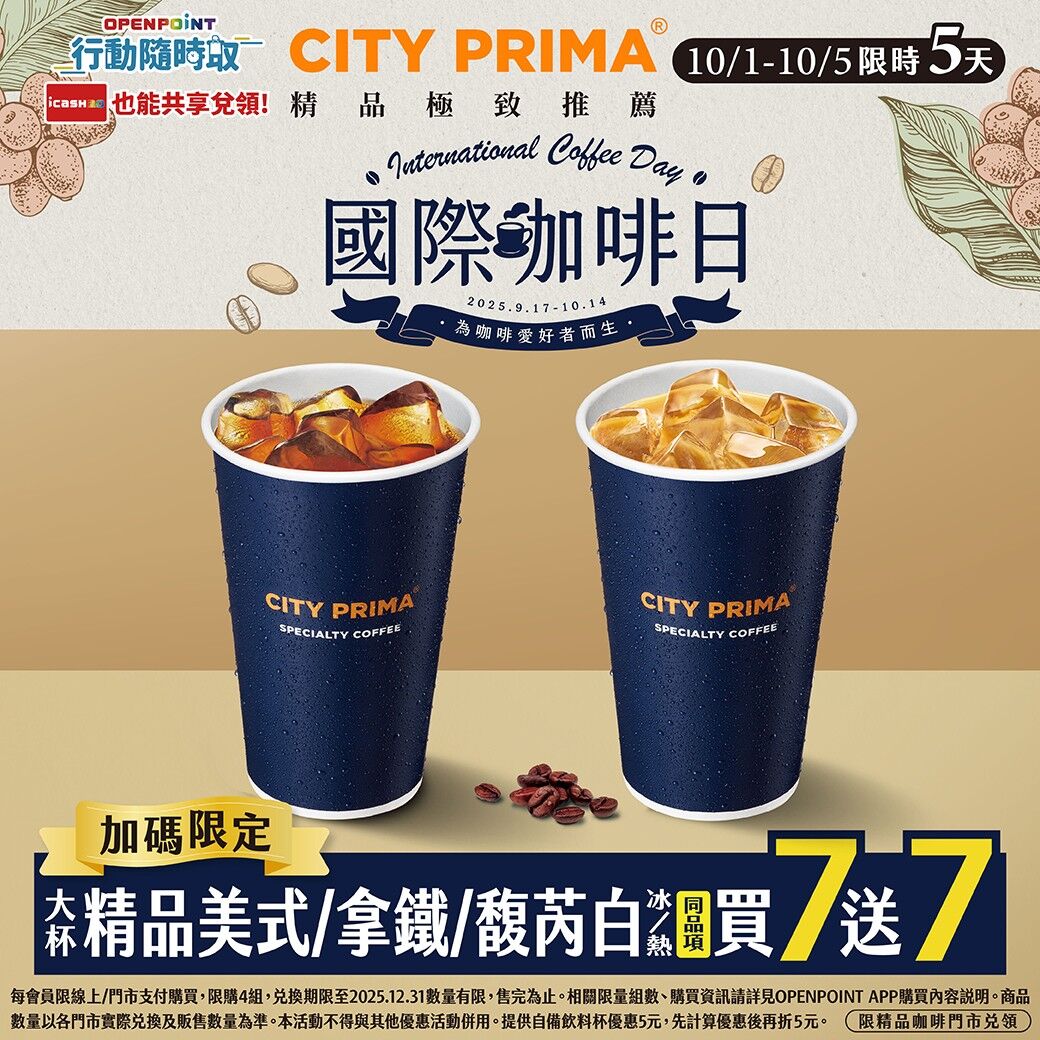 7-11 慶祝國際咖啡日,每月1日「一起精品吧」擴大優惠,10月1日至10月5日於「OPENPOINT行動隨時取」,推出CITY 大杯精品美式、精品拿鐵、精品馥芮白,冰熱不限皆享「買7送7」。