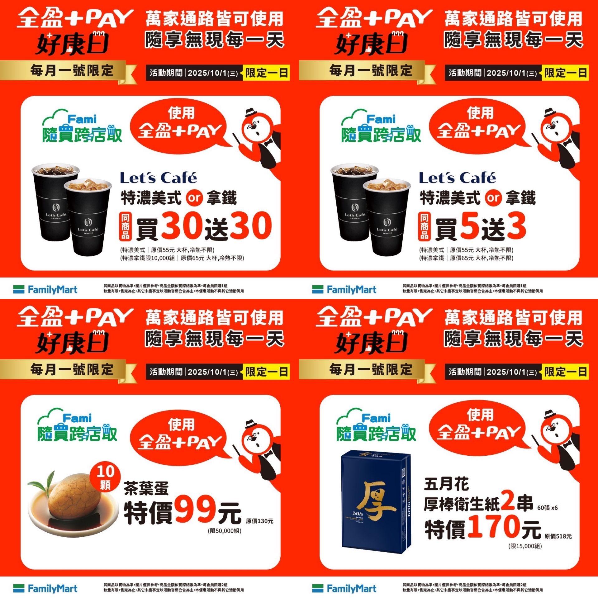 全家10月1日限定在APP隨買跨店取,使用「全盈+PAY」付款,可享Let's Cafe特濃美式、拿鐵「買30送30」,特濃美式、拿鐵「買5送3」。同時還有茶葉蛋10顆99元(原價130元)、五月花厚棒衛生紙2串170元(原價518元)。
