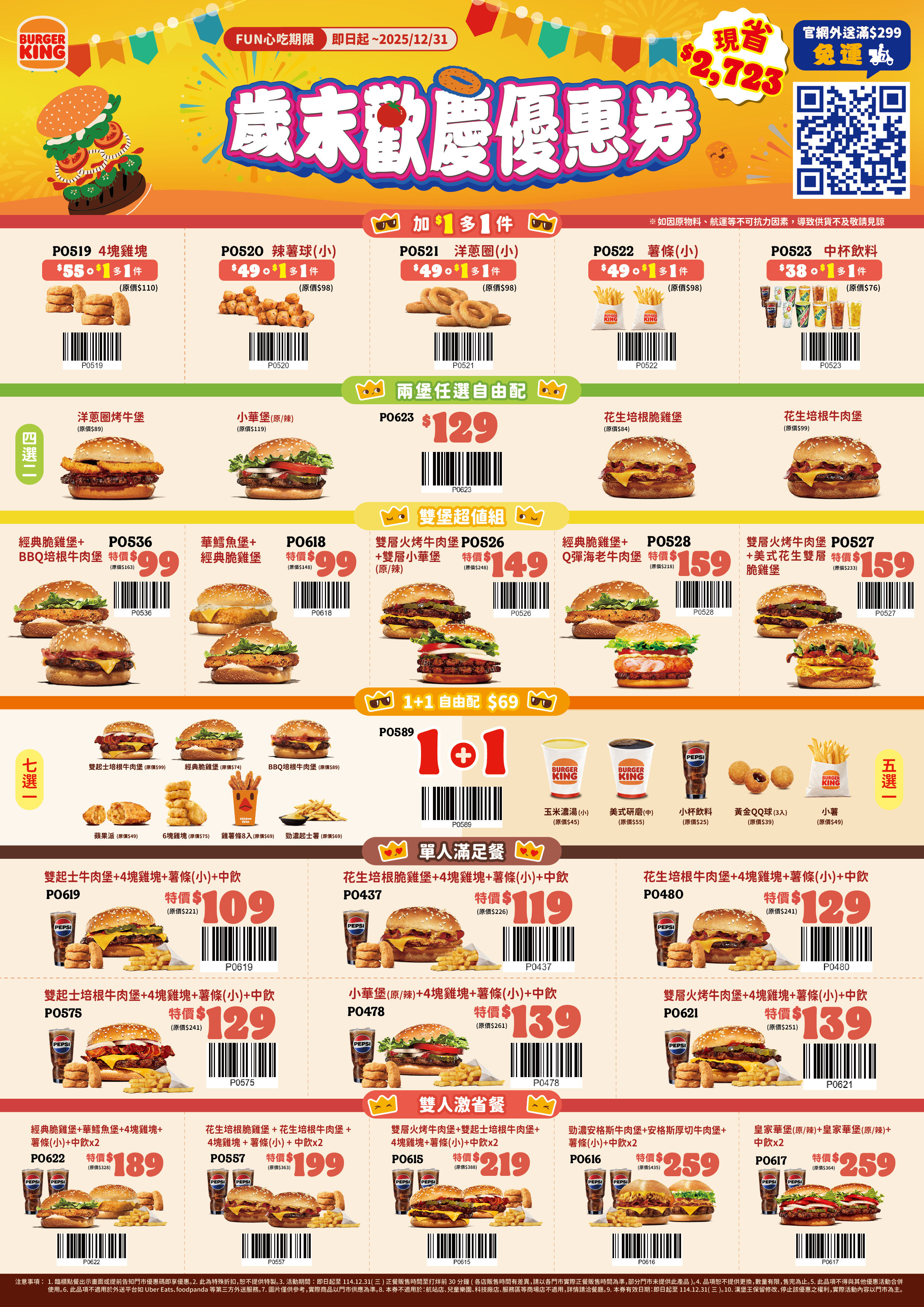 漢堡王「歲末歡慶優惠券」6大系列首推「5大夯品加1元多1件」,優惠品項有雞塊、辣薯球、洋蔥圈、薯條、中杯飲料;小資族最愛「1+1自由配」共有35種組合通通只要69元;「兩堡任選自由配」則提供4款人氣堡款任選2個129元,包括經典小華堡、花生培根牛肉堡等,最多可省超過百元。
