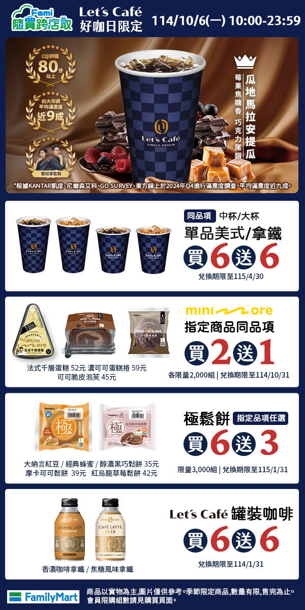 全家10月6日限定,指定單品美式、拿鐵「買6送6」,有中杯及大杯可選,冰熱不限,將於上午10點起於APP隨買跨店取開賣,可兌換至2026年4月30日。