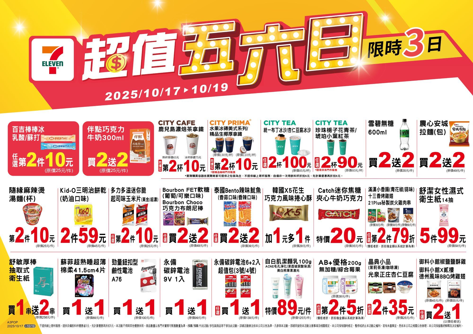 7-ELEVEN自10月17日至19日「超值五六日」優惠,CITY系列飲品、零食、飲料、泡麵、生活用品皆有折扣。