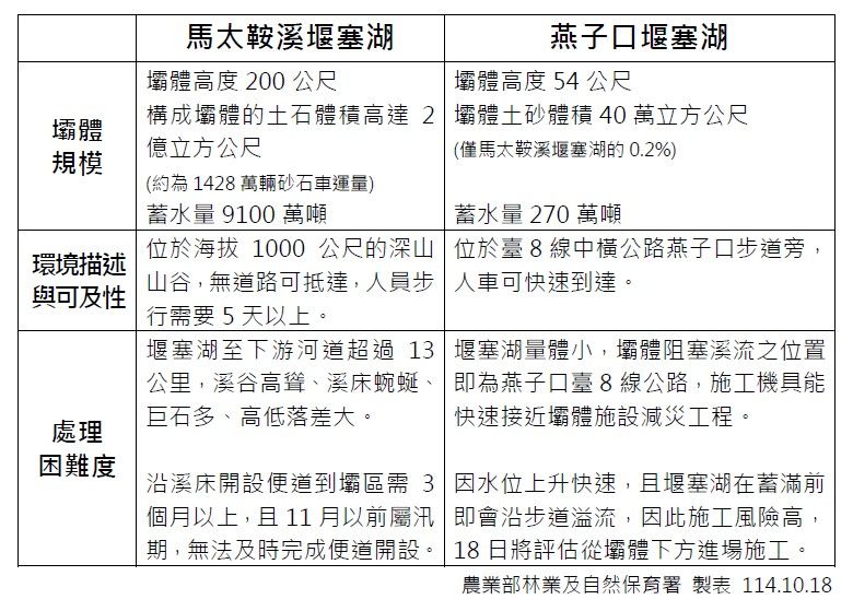 此外,馬太鞍溪堰塞湖壩體高200公尺,土石體積達2億立方公尺(約為1428萬輛砂石車運量)、蓄水量約9100萬噸;相較之下,燕子口堰塞湖壩高僅54公尺,壩體體積約40萬立方公尺、蓄水量約270萬噸,壩體體積僅為馬太鞍溪堰塞湖的0.2%,工程介入的難易度也明顯有別。