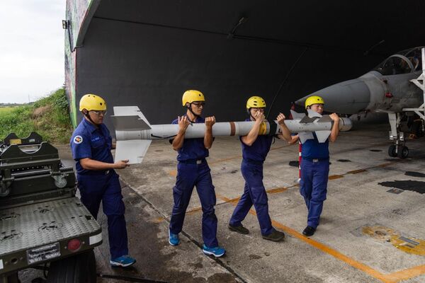 武掛分隊官兵接獲任務命令後,迅速展開掛載作業,為幻象2000戰機裝掛2枚魔法二型飛彈,由4位官兵採人工方式進行,全程依據標準作業程序完成飛彈掛載與系統測試,確保任務執行安全無虞,展現地勤團隊平日默契與扎實訓練。