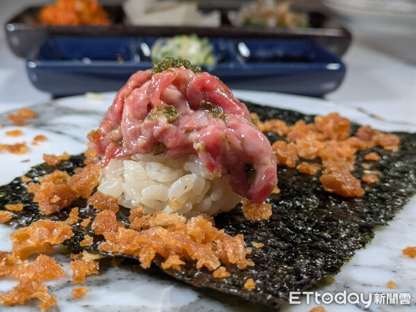 「麻薏生牛肉最中餅」,則用酥脆的日式最中餅作為外殼,集結和牛生牛肉、麻薏凍、鬆軟地瓜泥、酥炸吻仔魚乾等元素。