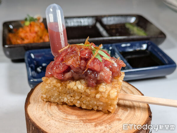 業者表示,「八和香米生牛肉」將生和牛肉以油蔥調味,底層是略帶微微焦香的酥炸米糕棒,再以香菜苗點綴,隨餐並附上東泉辣椒醬滴管,食用時擠在肉上面,鹹甜微辣的醬香,突顯生和牛的鮮美。