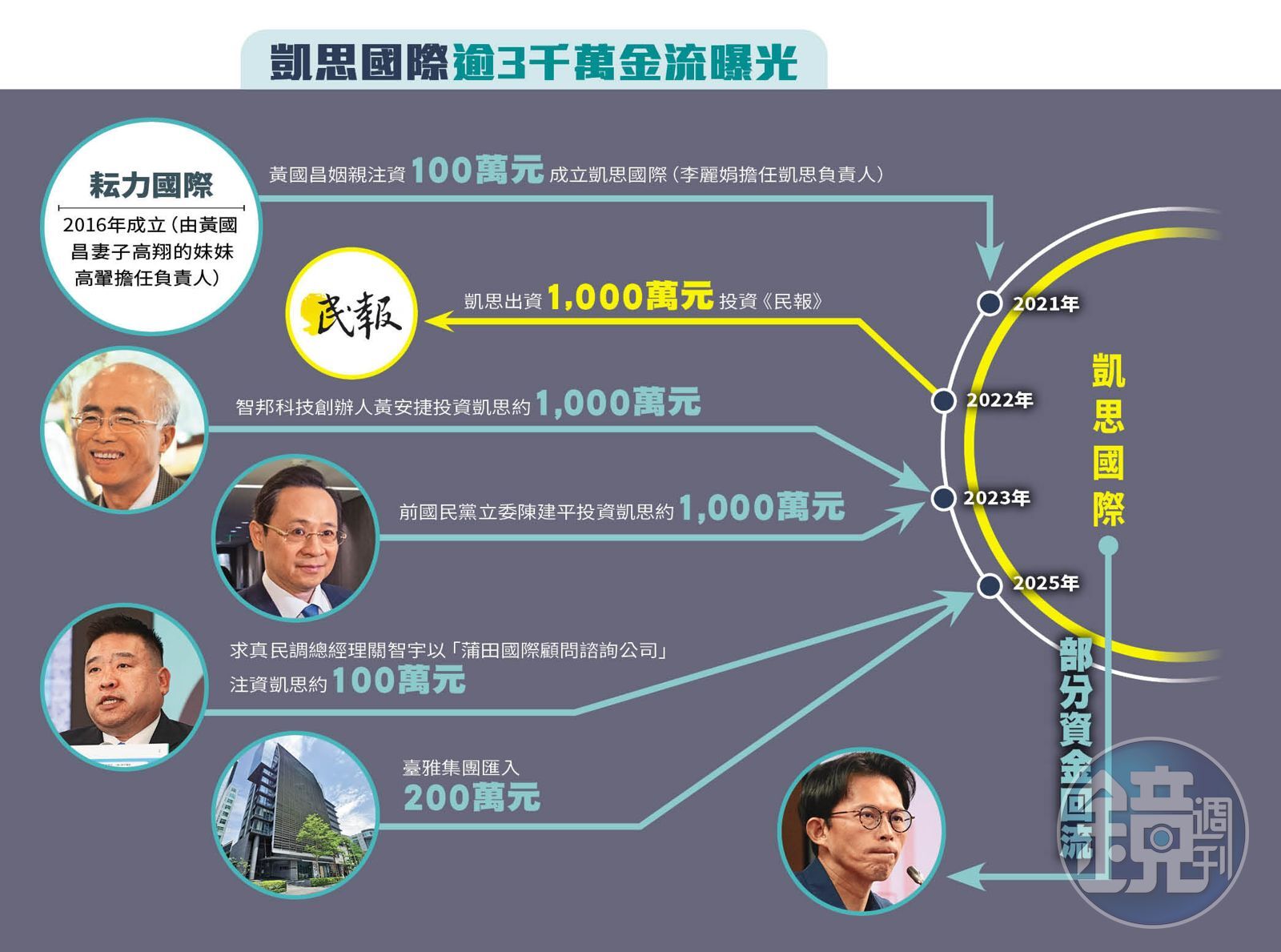 此外,凱思公司帳戶出現的挹注資金,包括臺雅集團旗下寀奕公司、金主陳建平、黃安捷等人,恰巧都是黃國昌在國會公開質詢的案件對象,進一步印證黃拿錢辦事的行徑,整起貪汙風暴也隨著金流浮現持續擴大。