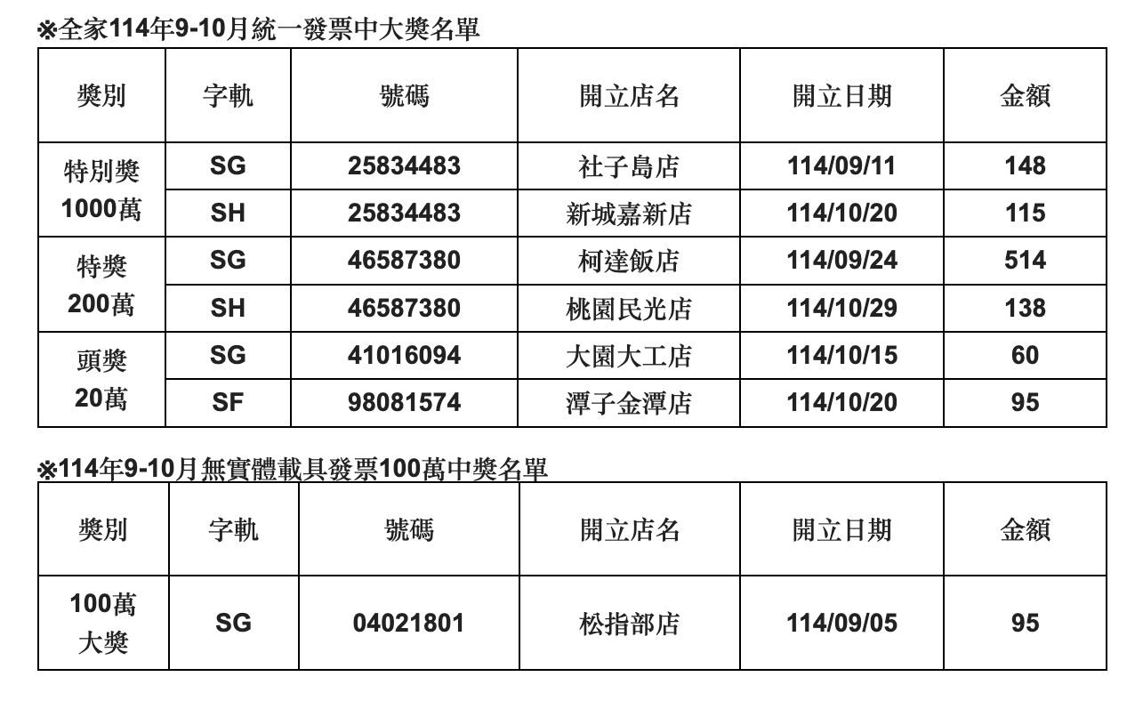 財政部今(25)日開出114年9月至10月統一發票中獎號碼,全家便利商店公布這期共有6位幸運兒抱走大獎,開獎店舖橫跨台北、花蓮、桃園及台中,其中特別獎1000萬元開出2組,獎落全家社子島店、花蓮新城嘉新店。