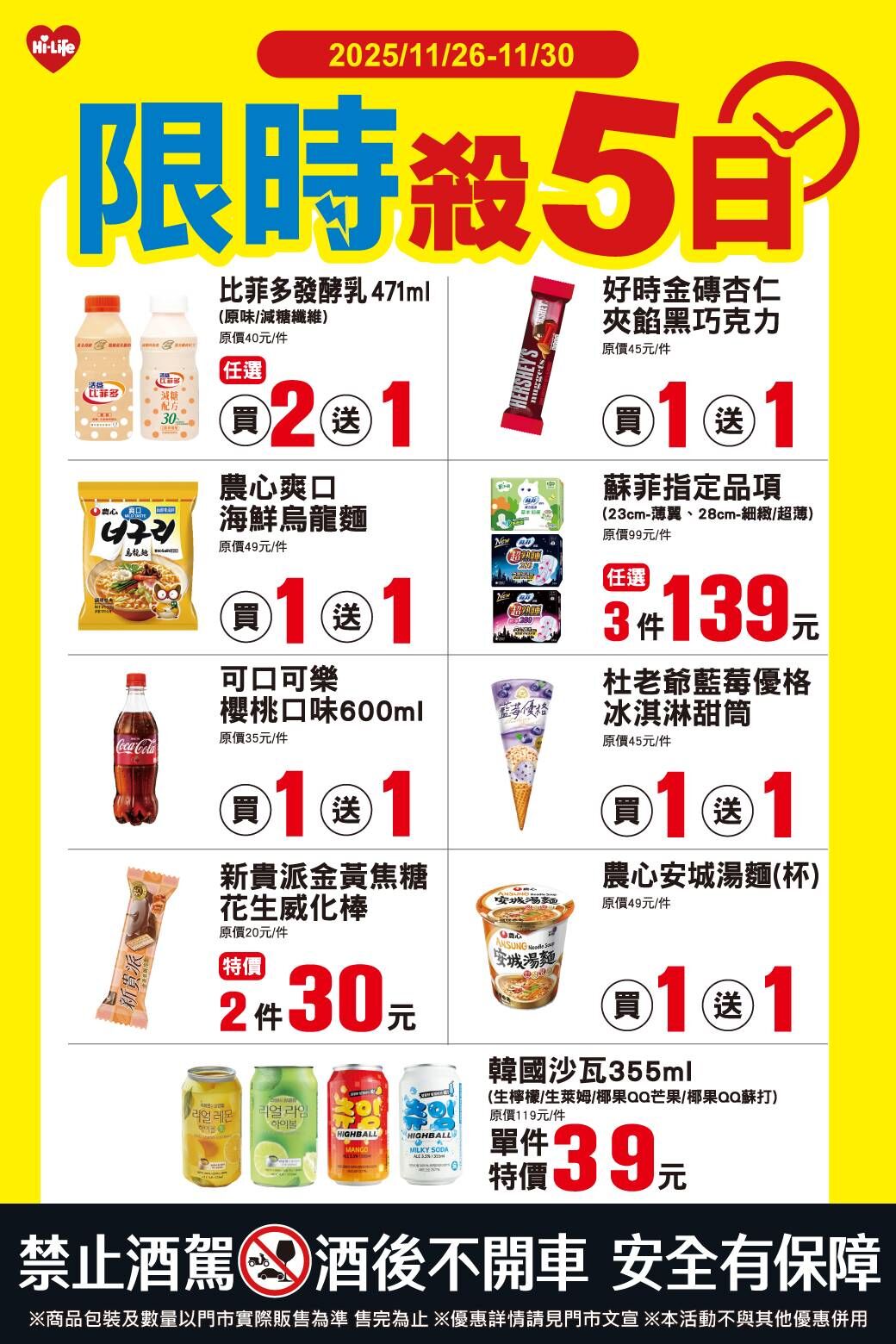 同時,11月26日至11月30日萊爾富推出「限時殺5日」活動,多項飲品與零食限時優惠。包括:比菲多發酵乳471ml任選「買2送1」、好時金磚杏仁夾餅黑巧克力「買1送1」、農心爽口海鮮烏龍麵與農心安城湯麵(杯)皆「買1送1」。