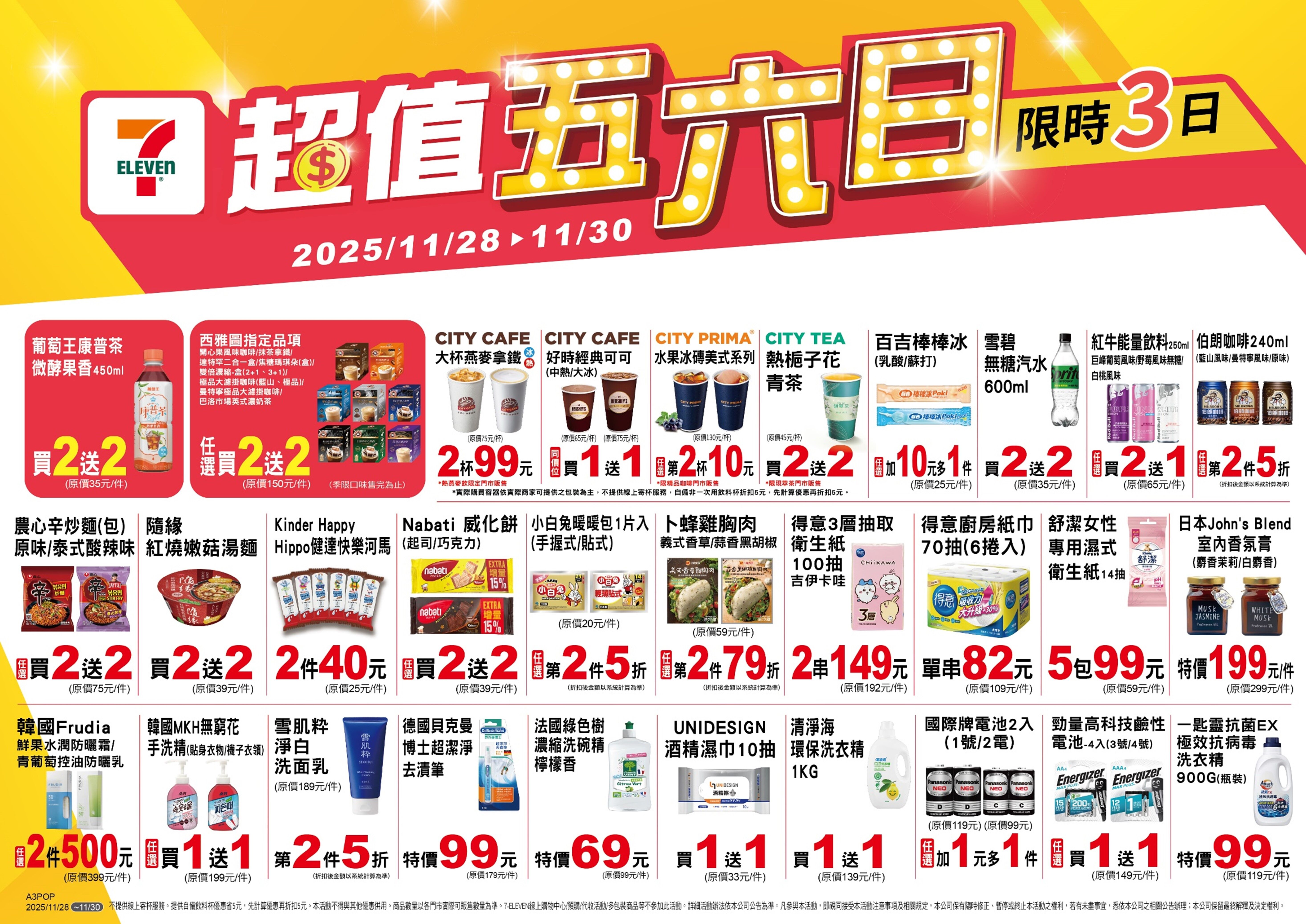 7-11自11月28日至11月30日「超值五六日」多項優惠