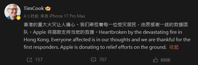 香港大埔宏福苑嚴重火災釀128人死亡、79人受傷的重大悲劇,災情震驚各界。包括蘋果公司(Apple)在內的國際企業都對此表達關切,蘋果執行長庫克(Tim Cook)在社群平台發文表示,對這場災難性的火警深感痛心,並承諾蘋果將捐款支持香港當地的救援與重建工作。