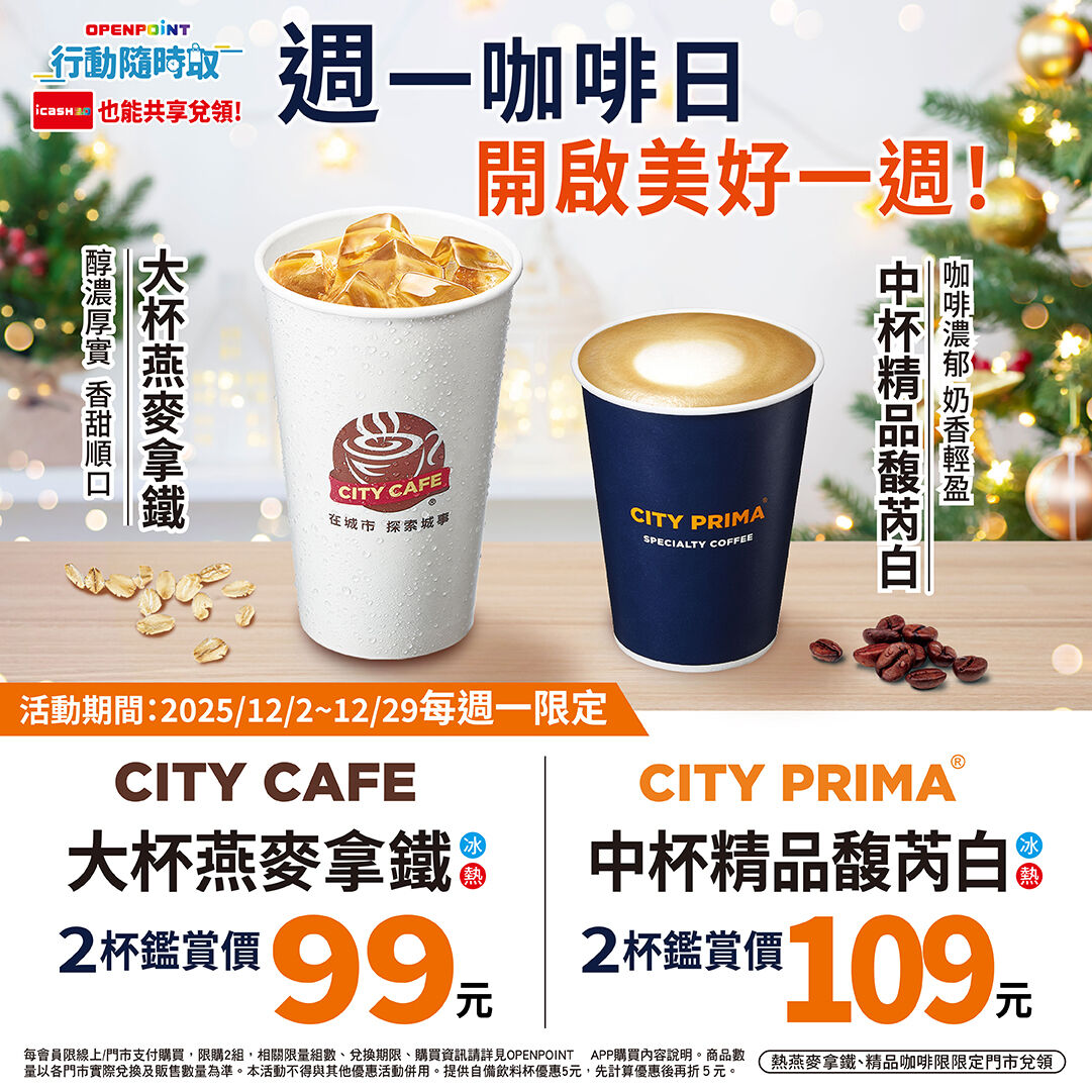 12月起每周二「質感咖啡日」,在「OPENPOINT行動隨時取」限定icash Pay支付,CITY PRIMA 中杯精品美式2杯99元(限量5000組)。