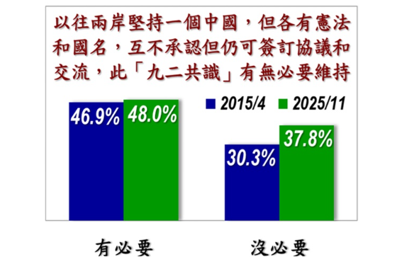 針對兩岸議題,民調詢問「過去國民黨執政時和對岸中共政府都堅持一個中國的原則,但是各有各的憲法和國家名稱而且互相不承認,雙方政府仍然可以簽訂協議進行交流,這就是當時的『九二共識』。您認為有沒有必要維持兩岸以前的這個基礎和作法」,48.0%認為有必要,其中22.0%很有必要、26.0%還算有必要,比10年前增加1.1個百分點,另有37.8%認為沒必要,比10年前增加7.5個百分點,未明確回答的有14.2%。