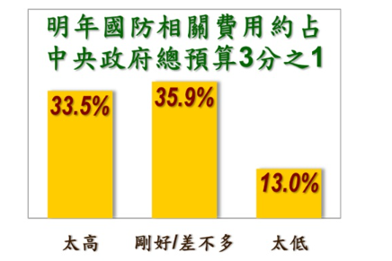 針對國防預算,民調詢問「國防相關的經費大約占政府明年總預算的3分之1,您認為這個比例太高、太低、或剛好」,結果顯示,33.5%民眾認為該比例太高,有35.9%認為該比例剛好或差不多,另有13.0%認為該比例太低,未明確回答的有17.6%。