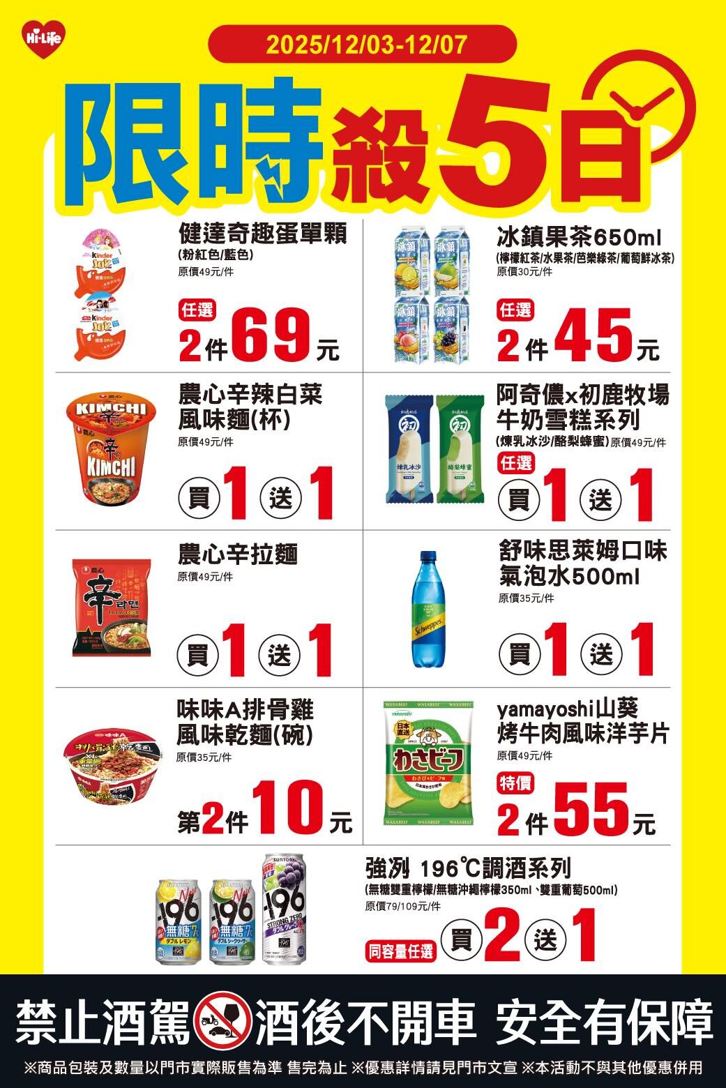 萊爾富12月3日至12月7日推出「限時殺5日」優惠,多款熱銷商品下殺,包括人氣健達奇趣蛋「任選2件69元」;冰鎮果茶650ml「任選2件45元」;阿奇儂×初鹿牧場牛奶雪糕系列(煉乳冰沙、醇熟蜂蜜雪糕)買1送1。泡麵控也有農心辛拉麵、農心辛辣白菜風味麵,通通「買1送1」,味味A排骨雞風味乾麵「第2件10元」。