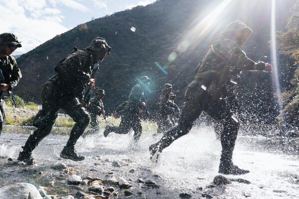 ▲學員自隱伏區出發採急迫渡河方式,沿大甲溪河床向目標區實施滲透。面對湍急水流與濕滑的岩石,隊伍依地形狀況彈性調整隊形,彼此掩護推進,克服水勢衝擊與地形限制,展現跨環境作戰的能力。(軍聞社李恬恬)