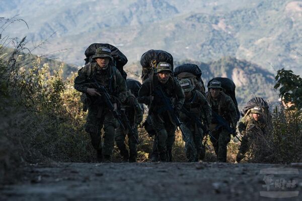 ▲學員派遣偵察組進入海拔1540公尺的阿冷山實施現地偵察,研擬機動路線;翌日,全員背負約40公斤的重裝挺進山區,運用地圖、指北針判定方位,在山林間以手勢默契溝通,並保持高度敵情警覺。(軍聞社李恬恬)