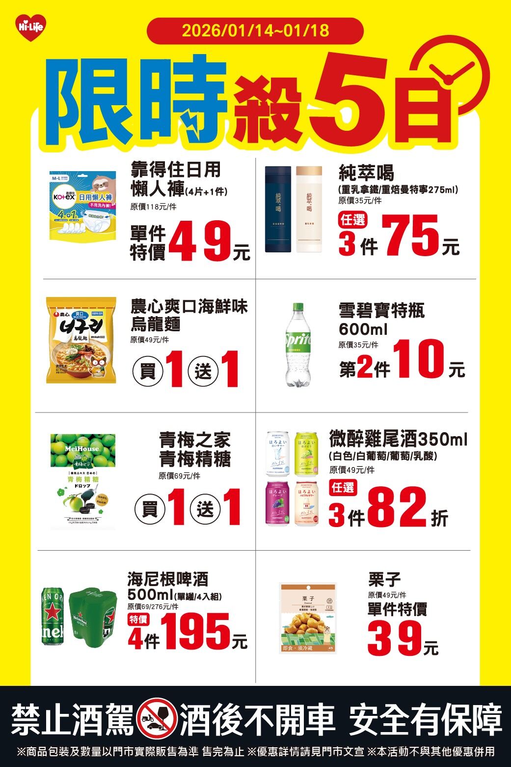 萊爾富即日起至1月18日推出「限時殺5日」精選日用品、即食食品、飲料推出多項限時下殺價格。食品部分,「農心爽口海鮮味烏龍麵」、「青梅之家青梅精糖」皆享「買1送1」,「栗子」單件特價39元。