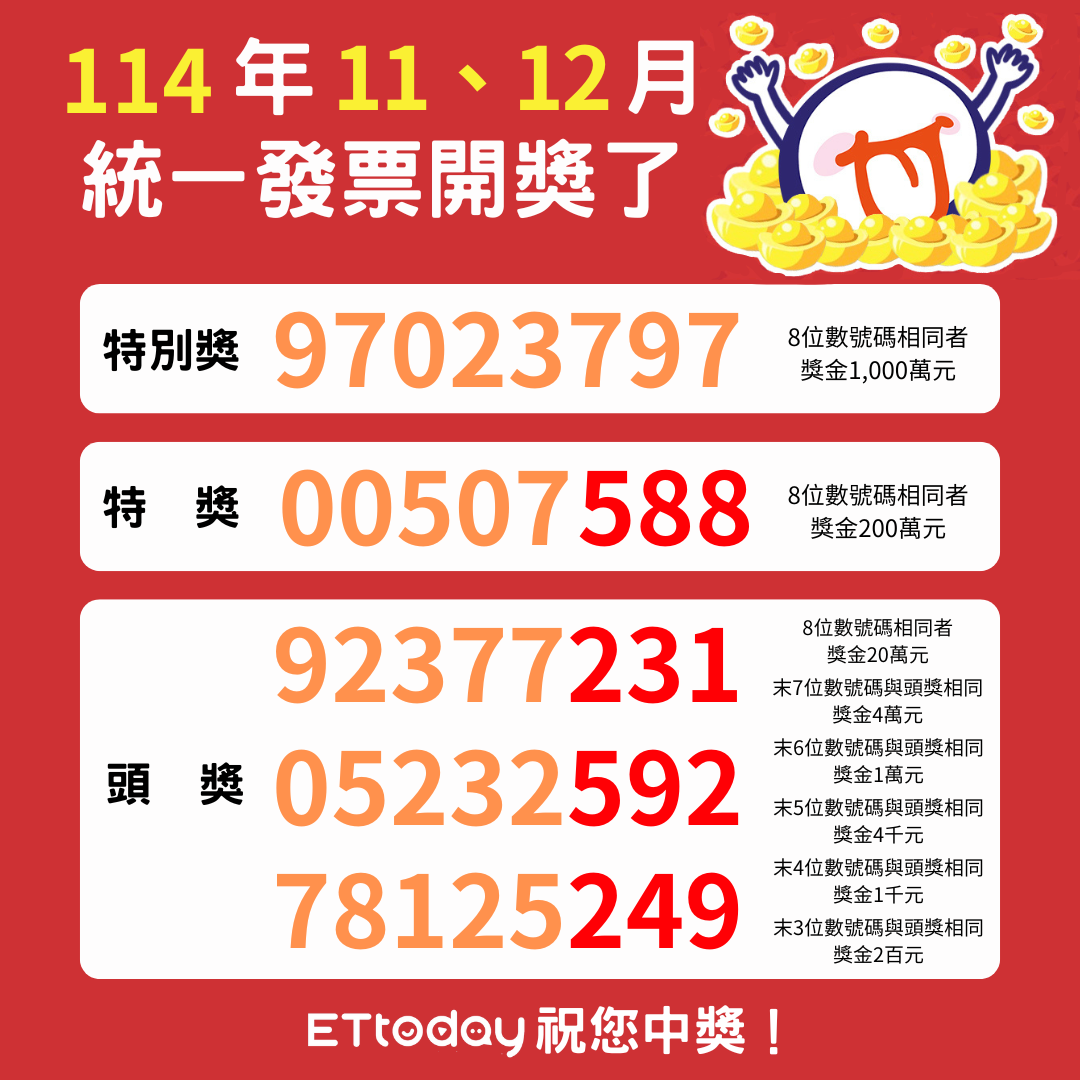 財政部今(25)日開出114年11-12月統一發票中獎號碼,全聯也宣布,這期開出1張千萬特別獎、2張200萬特獎,幸運門市分別在台中大智門市、桃園龜山大同、台北文山萬美門市。