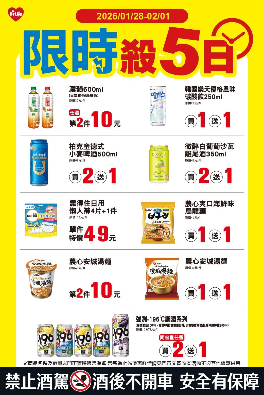 萊爾富1月28日至2月1日推出「限時殺5日」優惠,主打飲料、泡麵、民生用品促銷,多項「買1送1」。