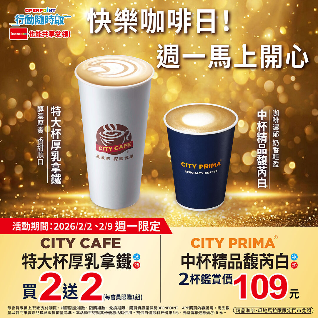 ・CITY CAFE 特大杯厚乳拿鐵(冰/熱),買2送2(每會員限購1組)。
