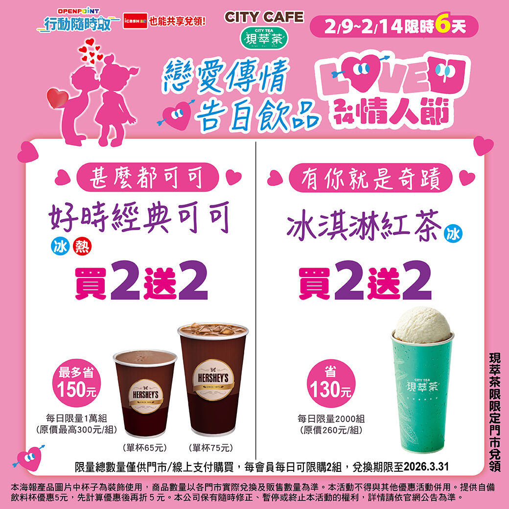 主打品項包含金莎心型巧克力禮盒、CupiCho松露巧克力與比得兔黑巧克力禮盒,民眾可提前預訂,於情人節前取貨,一次備齊花與甜點。「OPENPOINT行動隨時取」同步推出飲品分享活動,讓告白更有儀式感。