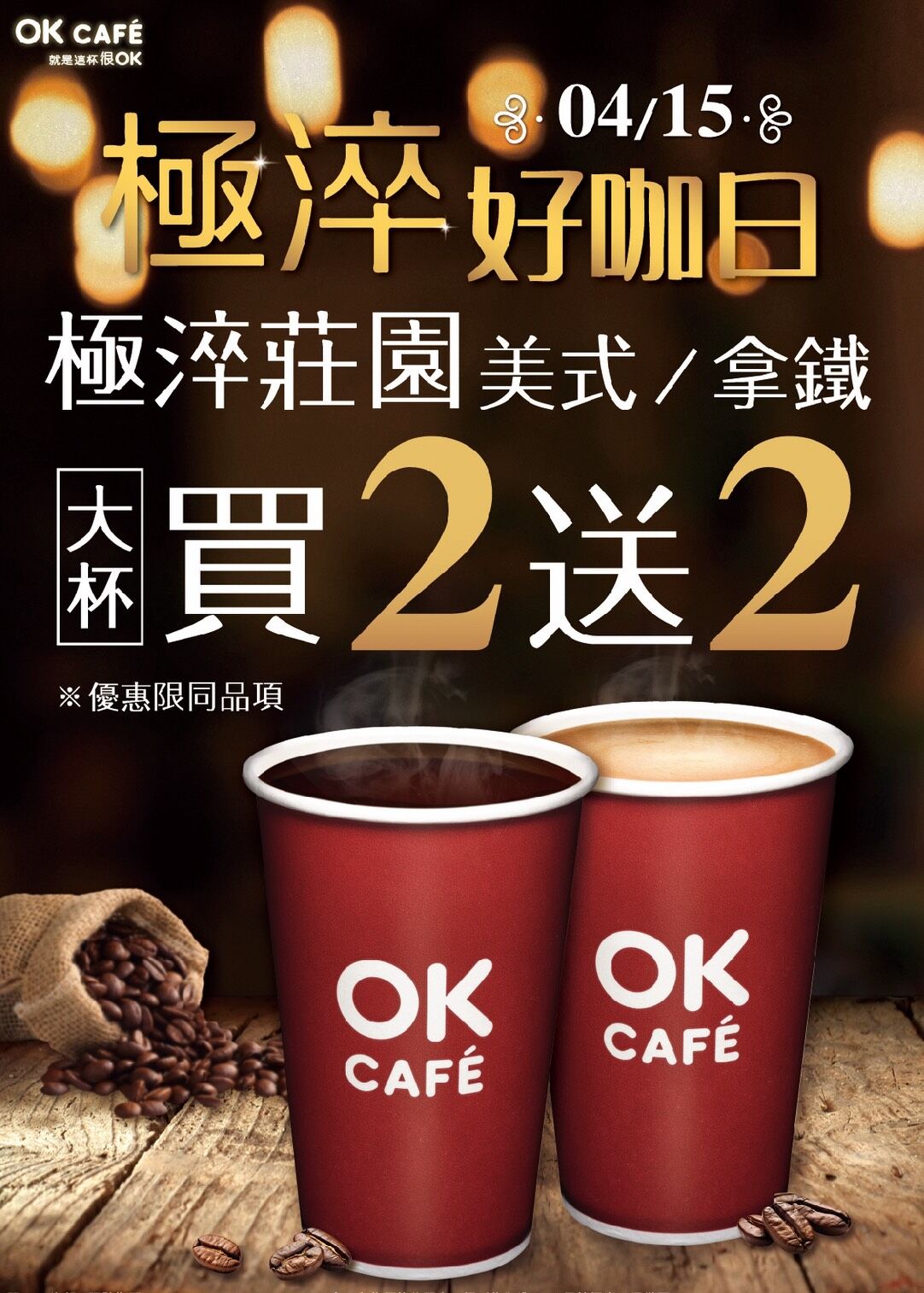 OKmart 鎖定咖啡族群,在4月15日當天推出OKCAFE「極淬莊園系列」買2送2優惠。