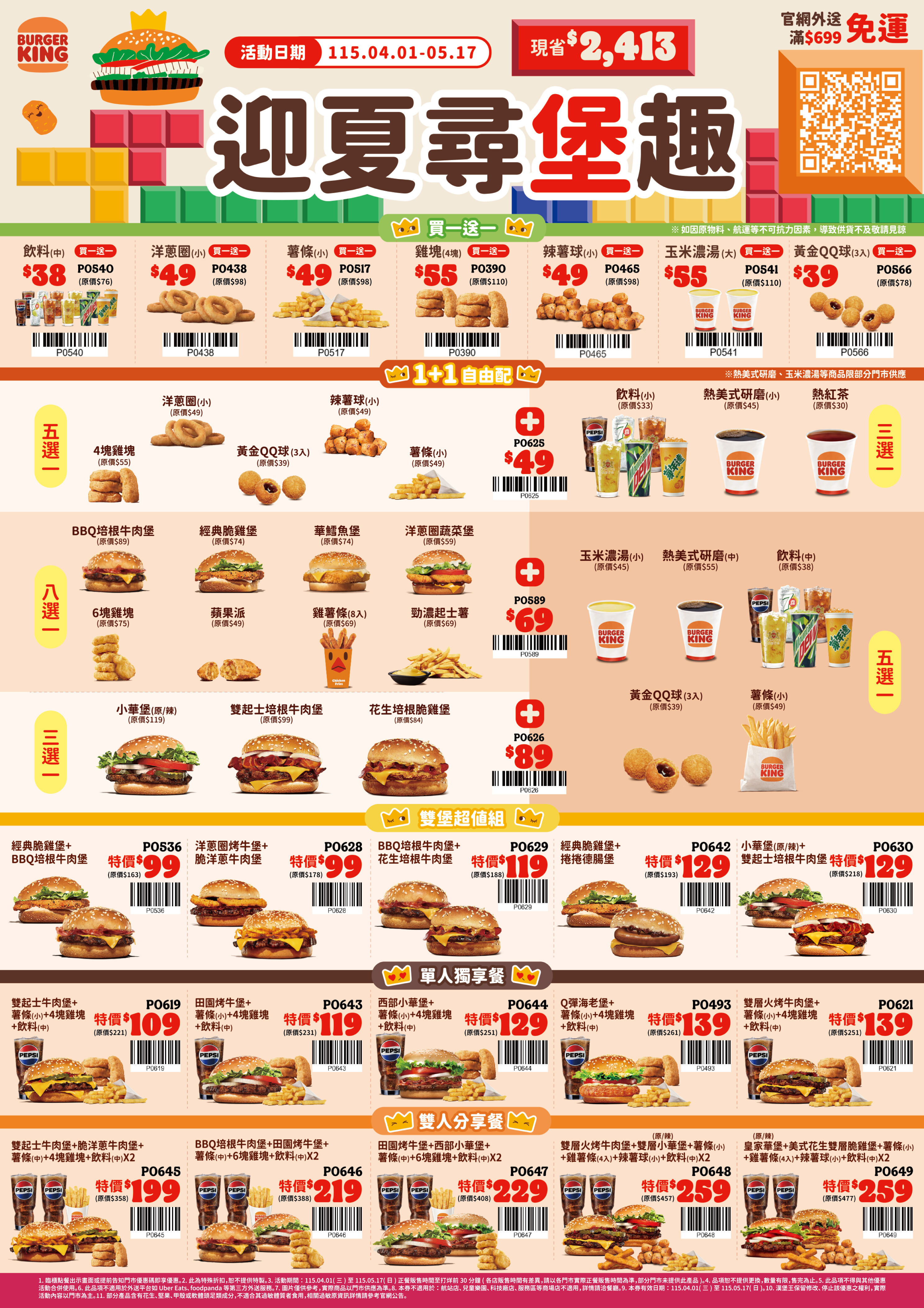 漢堡王5月17日前有「迎夏尋堡趣」激省優惠券,可享雞塊、薯條、辣薯球、洋蔥圈、黃金QQ球、玉米濃湯、飲料買1送1;「1+1自由配」最低49元起,像是小華堡(原價119元)加上薯條或飲料只要89元。